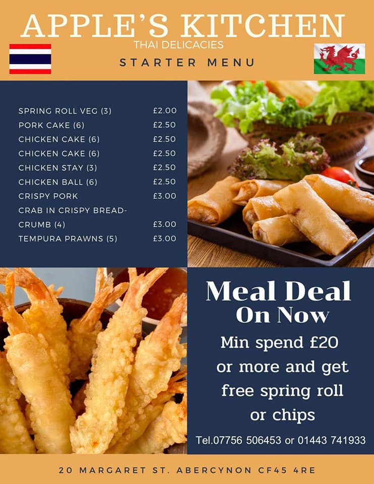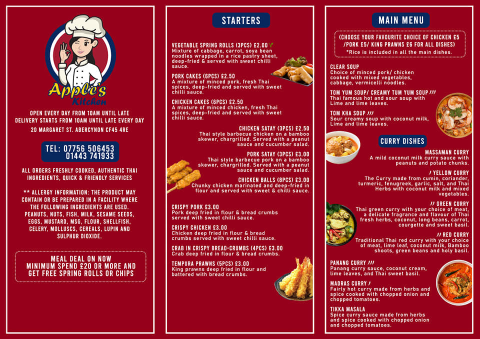 Overall, the menu at Apple’s Kitchen offers a satisfying and well-rounded selection of Thai-inspired dishes, with a clear emphasis on variety and comfort. The starters such as Vegetable Spring Rolls, Pork Cakes, and Chicken Satay provide a flavorful introduction, while soups like Clear Soup, Tom Yum Soup, and Tom Kha Soup add depth with their aromatic profiles. The curry section stands out with classics including Massaman Curry, Green Curry, Red Curry, and Panang Curry, alongside options like Chicken/Pork Panang and Yellow Curry, catering to different spice preferences. Stir-fried dishes such as Stir Fried Chicken With Cashew Nuts and Chicken/Pork Pad Phrik King bring balance with savory textures, complemented by noodle favorites like Pad Thai Prawn/Chicken and hearty rice dishes including Chicken Fried Rice and Tom-Yum Fried Rice. Additional items like Plain Omelet, Chicken/Pork Omelet, and sides such as Chips and Prawn Crackers round out the menu nicely. While prices are not listed, the breadth of options suggests a menu designed to appeal to a wide range of tastes, making it a reliable choice for both familiar favorites and comforting Thai staples.